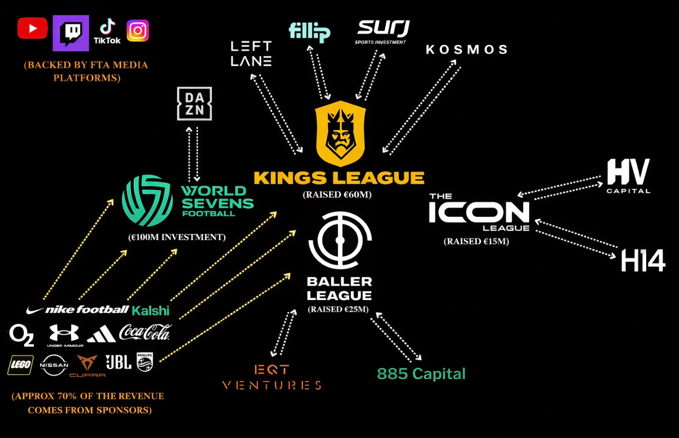 Over the past few years, a wave of short-format, digitally native competitions has emerged with a very different set of priorities. These leagues aren’t built around 90-minute matches, legacy broadcast deals, or generational fandom. They’re engineered for instant drama, constant clips, and cultural relevance. Think Kings League, Baller League, World Sevens Football, Icon League. On the surface, they look like football. Under the hood, they operate like media startups.