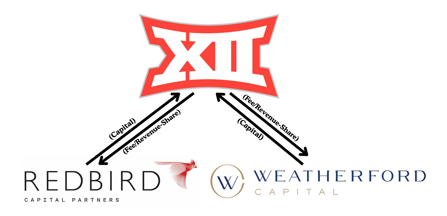 The conference is now negotiating a roughly $500 million “strategic partnership” with RedBird Capital and Weatherford Capital which is a deal that looks nothing like traditional private equity. No ownership transfer. No board seats. No equity dilution. On paper, the Big 12 keeps 100% of its institutional control.